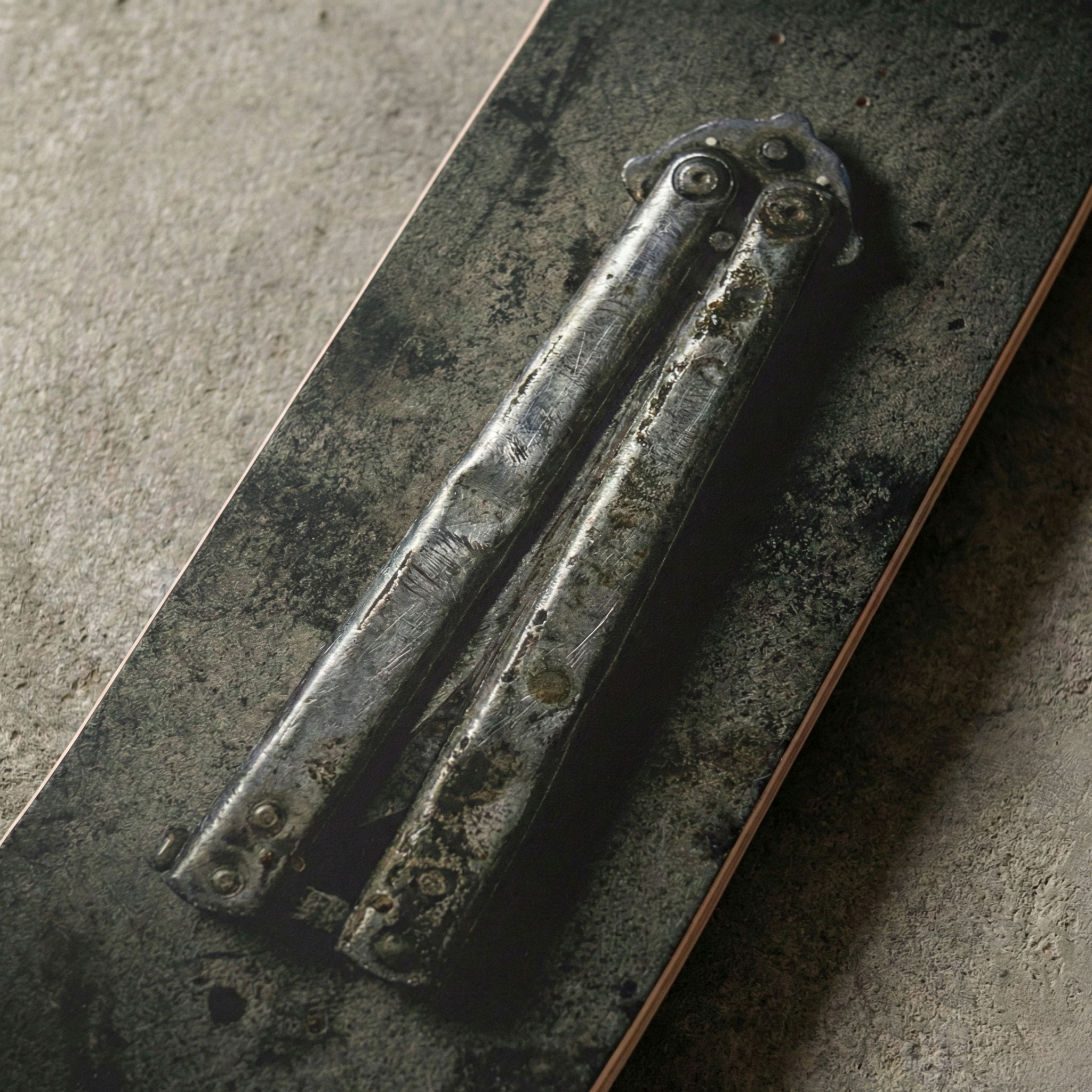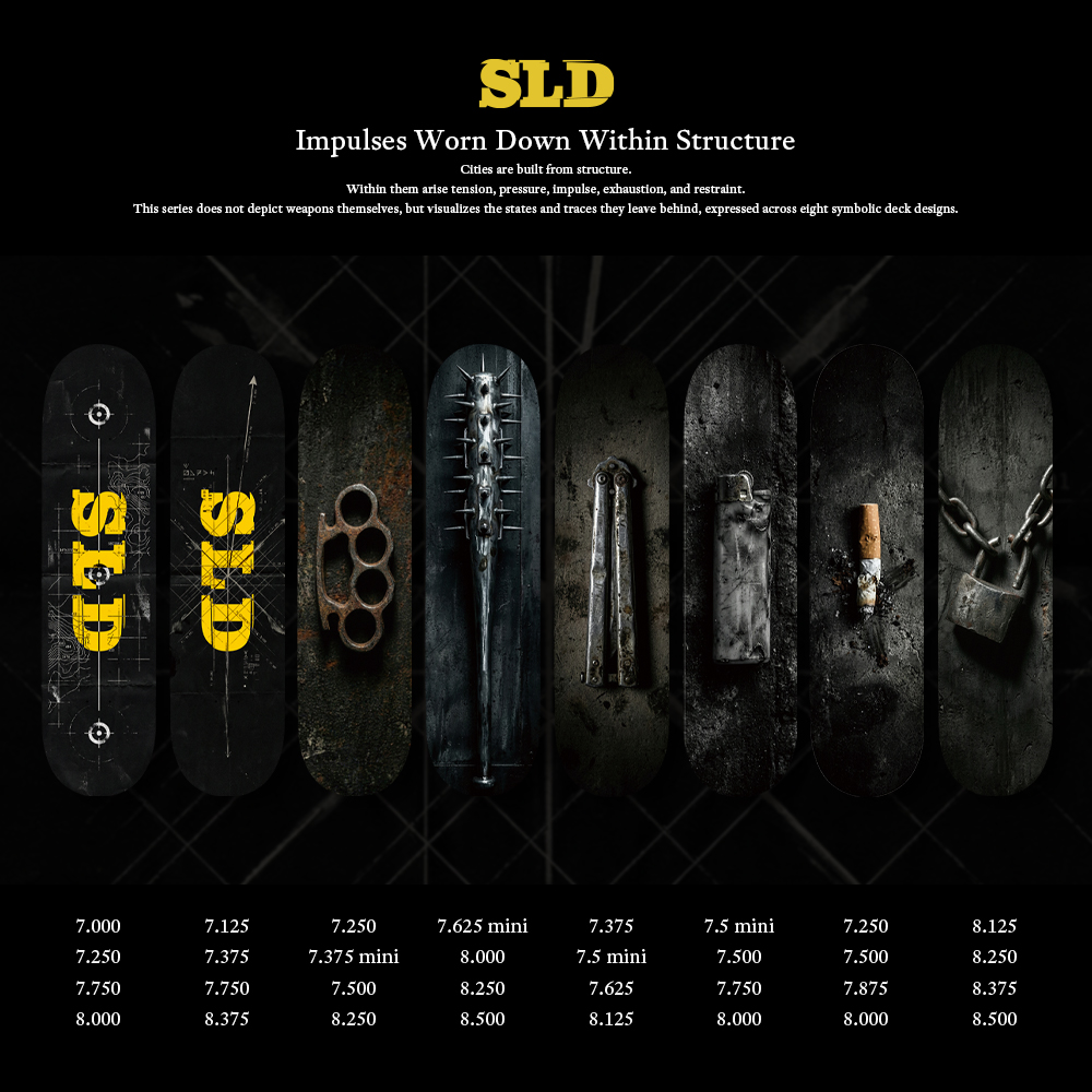 衝動は、構造の中で削られる。 2026/01/29 Board CONCEPT このシリーズは、都市の中で削られていく衝動を、スケートデッキという形に落とし込んだものだ。 このシリーズが扱うのは、武器そのものではない。 都市に存在する構造やルールの中で、人や身体が受け取る緊張や圧、衝動の行き場、そして消耗。 それらを象徴的なモチーフとして置いている。 形ではなく、残された状態。 破壊ではなく、痕跡。 THE SERIES 本シリーズは、以下の全8型で構成されている。 BLUEPRINT VECTOR BRASS SPIKE FLIP IGNITE REMAINS LOCKED これらは単体でも成立するが、 8型でひとつのシリーズとして設計されている。 REMAINS 燃え尽きたあとにだけ残る、衝動の形。 MADE TO ORDER 本シリーズは受注生産。 必要以上につくらず、この期間に選ばれた分だけを形にする。 本シリーズは受注生産(予約販売)で展開される。 大量に作らず、必要な分だけを形にする。 数量や希少性で煽るためではなく、今このタイミングで選ばれたものを、確実に届けるための形式。 PRODUCTS 受注期間:〜2月15日 8型のデッキ一覧を見る ※各モデル画像をタップすると個別ページへ移動します。